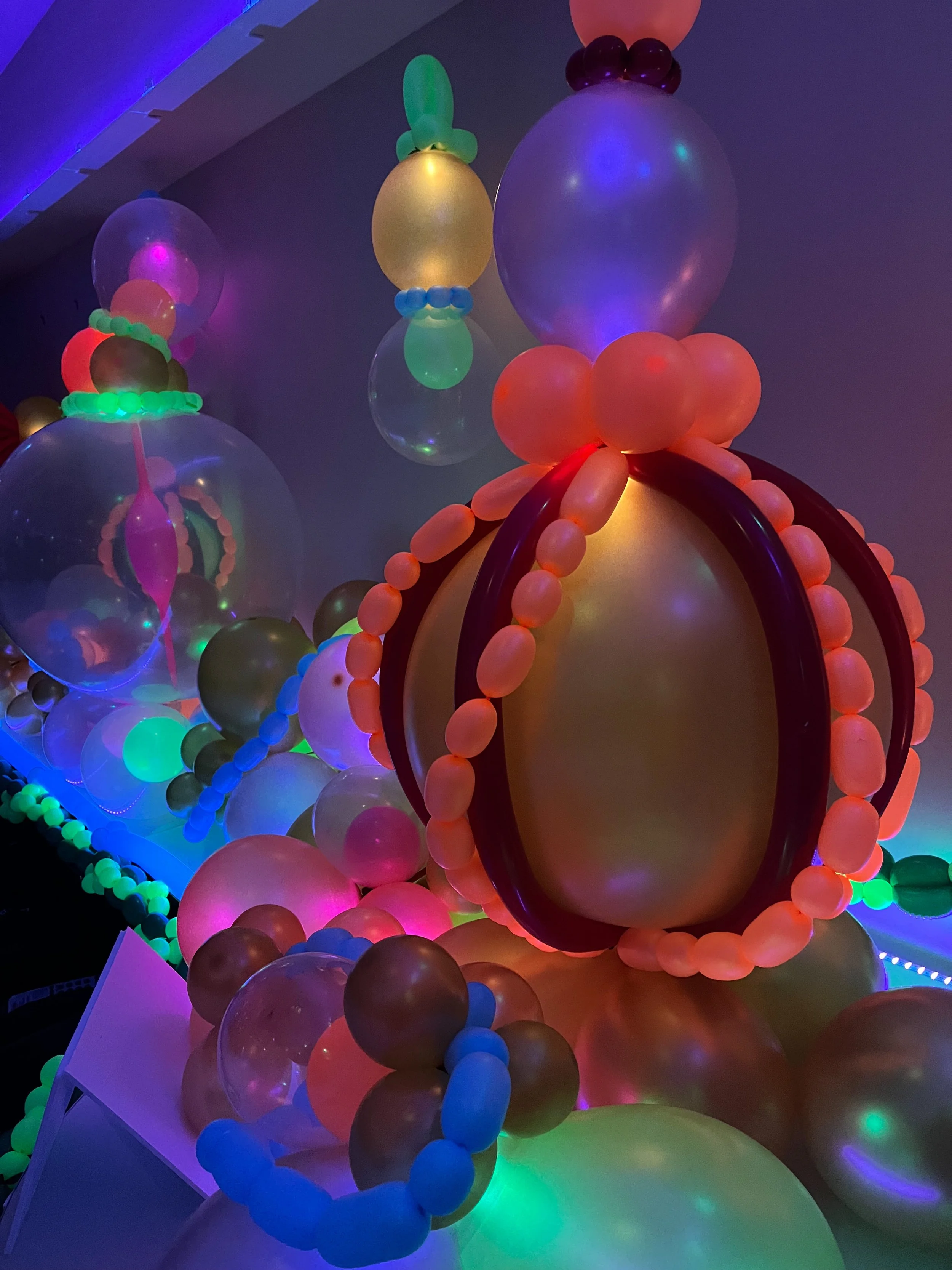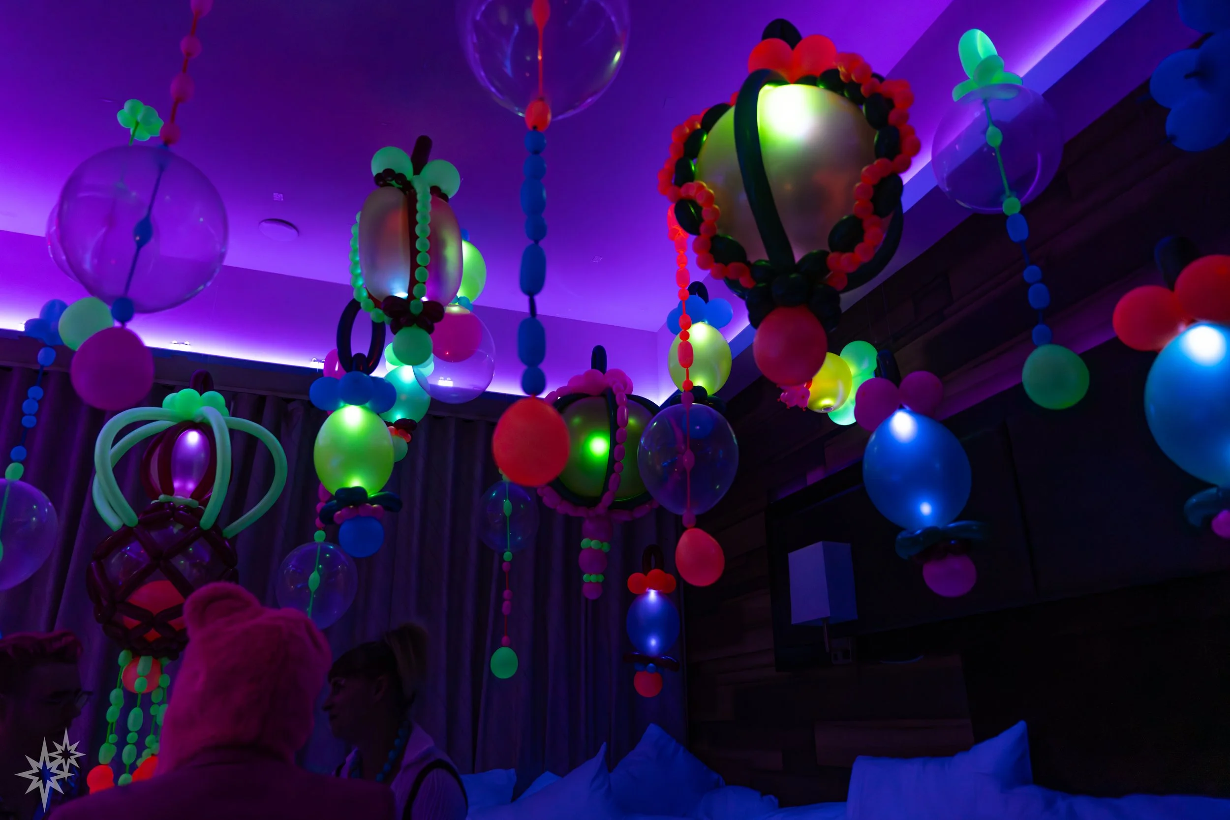 The Balloominarium is a magical space activation that brings people in touch with their sense of wonder and connection. The floor- mostly bed. The ceiling- mostly balloons. The soundtrack is calming, if you can hear it over the sounds of conversation. Our balloominologists serve custom wearable glowing balloon creations while getting to know you.